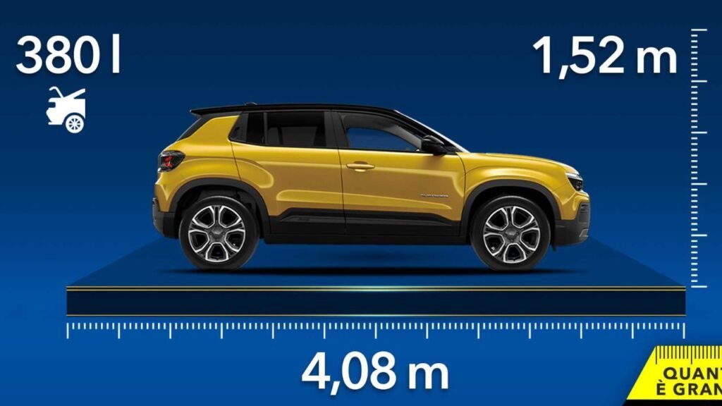 La Jeep Avenger è lunga 4,08 metri, larga 1,78 metri e alta 1,53 metri, dimensioni ideali per la guida in città.